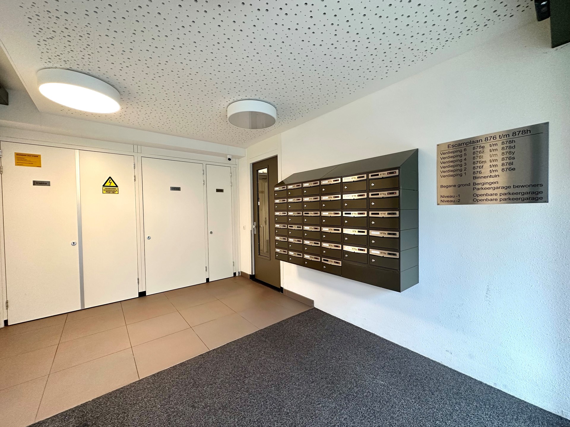 De gemeenschappelijke hal/entree met bellentableau biedt toegang tot de appartementen, de liftinstallatie, het trappenhuis en de parkeergarage.
