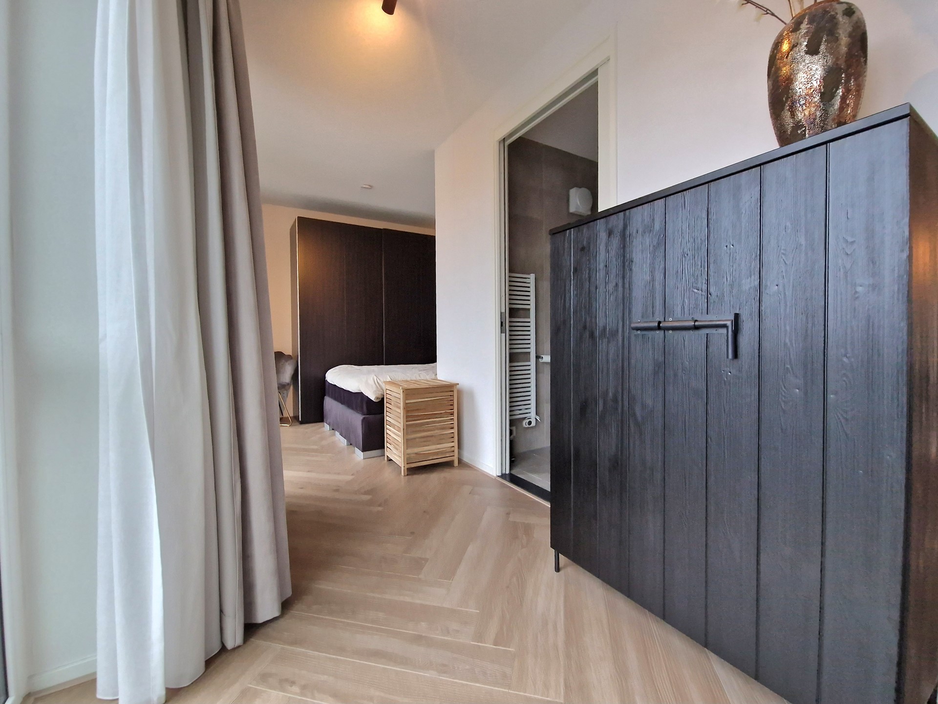 ACHTSTE VERDIEPING: Eigen entree, berging op de gemeenschappelijke gang. Lichte woonkamer door de hoekligging. De open keuken is voorzien van onder andere een koelkast, een inductie kookplaat en een vaatwasser. De volledig betegelde badkamer is voorzien van een inloopdouche, een toilet en een wastafelmeubel met spiegel. Het slaapgedeelte biedt voldoende ruimte voor een 2-persoonsbed en een grote kledingkast.