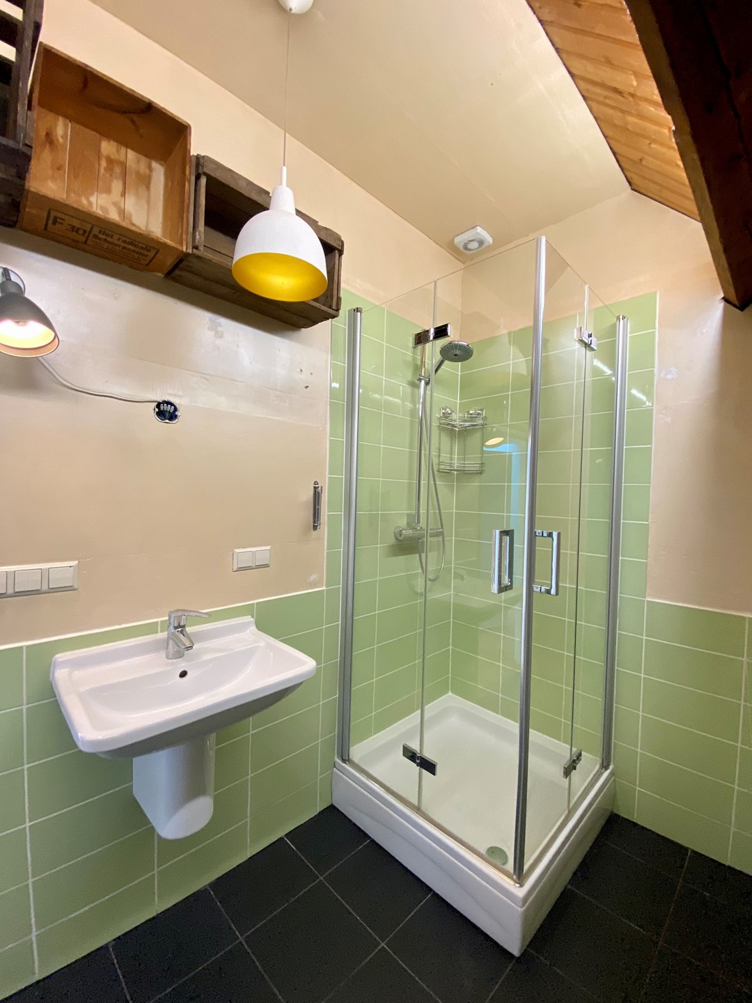 De badkamer is voorzien van een ligbad, separate douche, wastafel met spiegel en een handdoekenradiator.