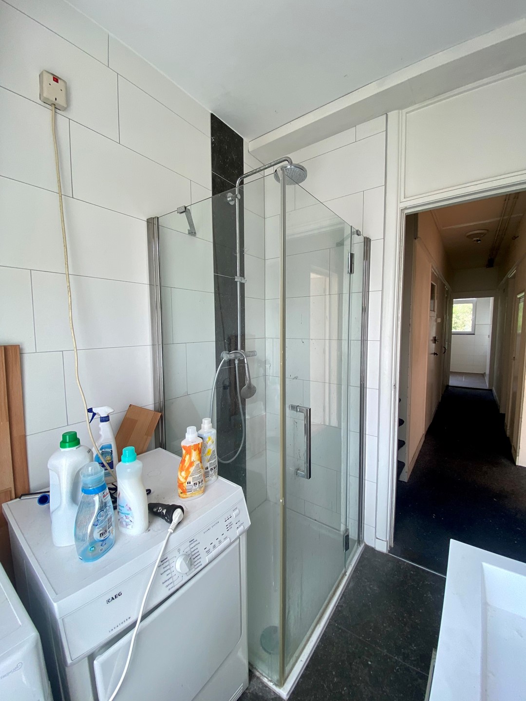 EERSTE VERDIEPING: Gang waarvandaan alle vertrekken bereikbaar zijn. De gang is ook toegankelijk voor 2 andere gebruikers en kan niet worden afgesloten. De bewoner van de derde verdieping maakt ook gebruik van de (trap-)opgang. Twee ruime kamers die ofwel als woonkamer en slaapkamer gebruikt kunnen worden, of als 2 ruime slaapkamers. De badkamer ligt aan de straatzijde en is voorzien van een ruime douche, een wastafelmeubel met spiegel en een wasmachine-/drogeropstelling (wordt "om niet" overgenomen). De keuken ligt aan de achterzijde en is voorzien van een net keukenblok met een gaskookplaat. Hiervandaan is het achtergelegen balkon bereikbaar.