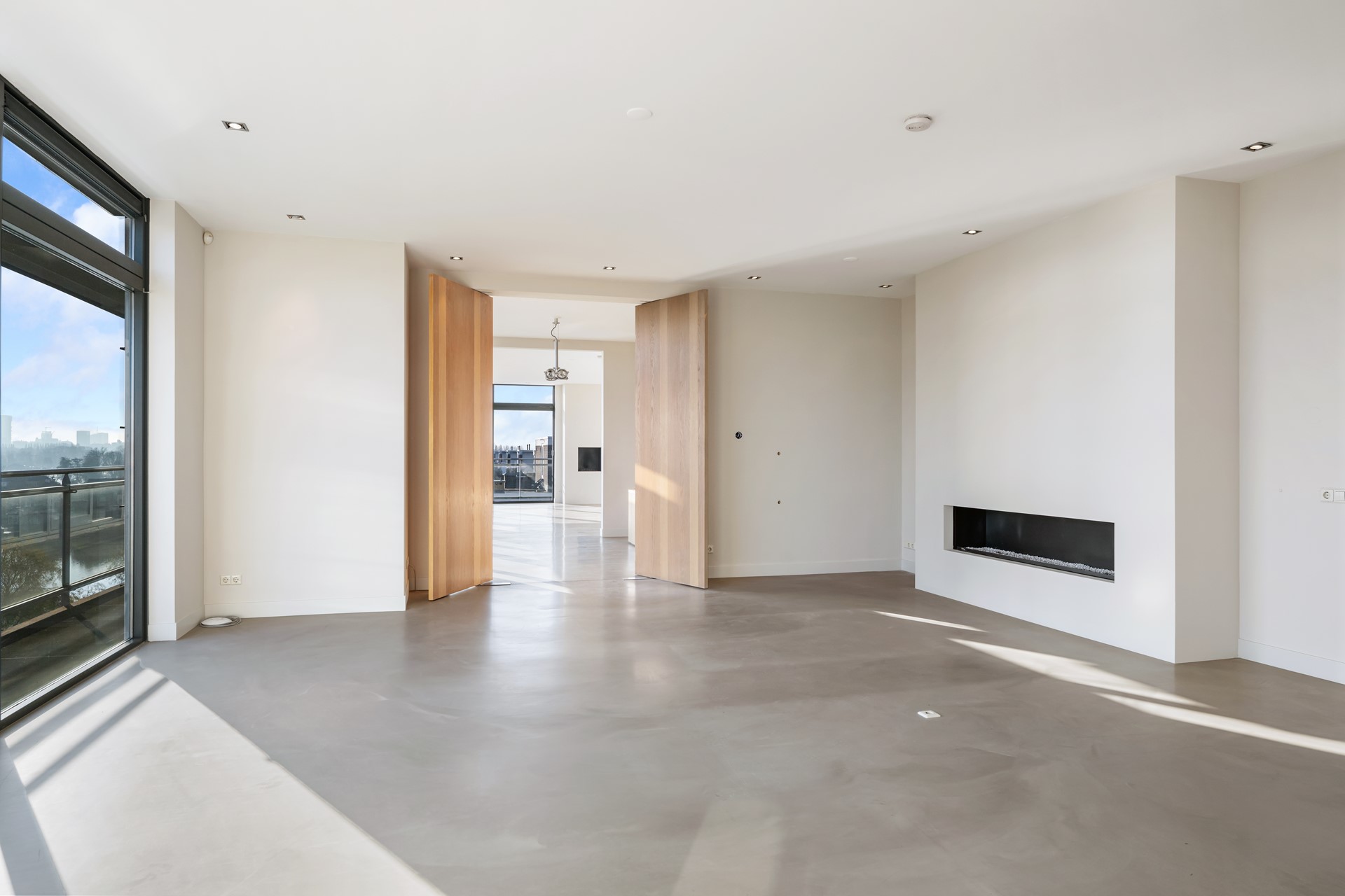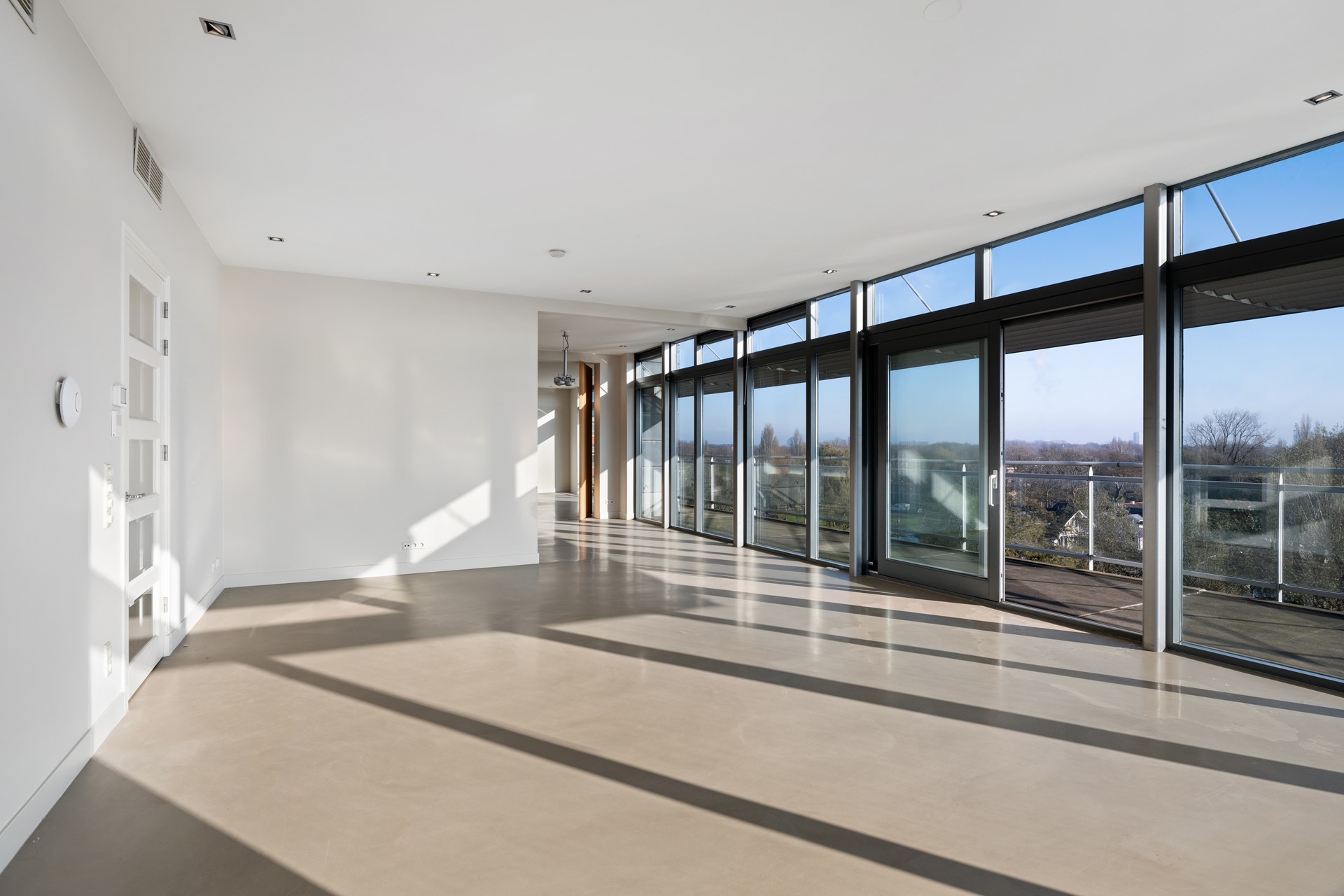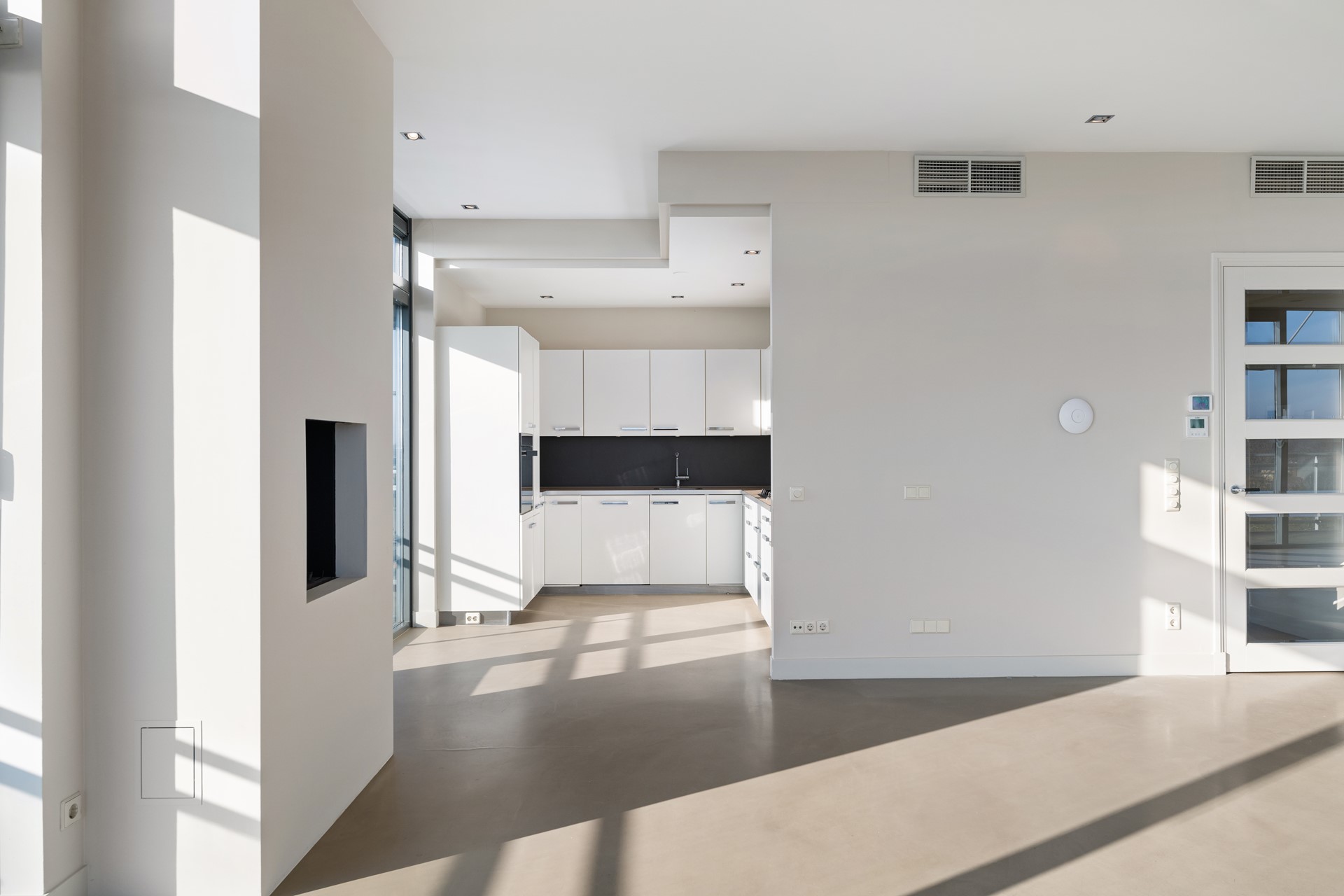 Lichte woonkamer, 3 meter hoog, glaspuien tot de vloer. Open haard (gas). Aparte doucheruimte. Schuifpui naar het grote zonnige terras. Halfopen keuken met deur naar terras.