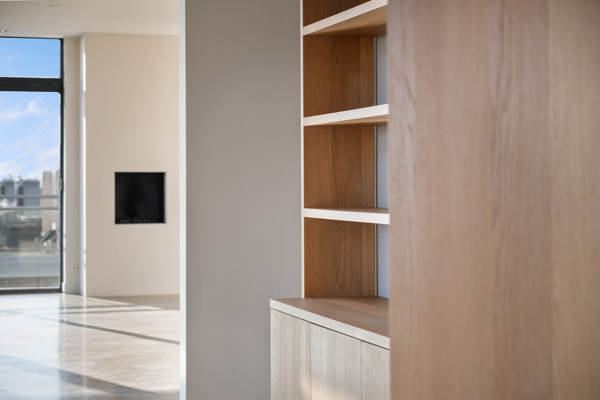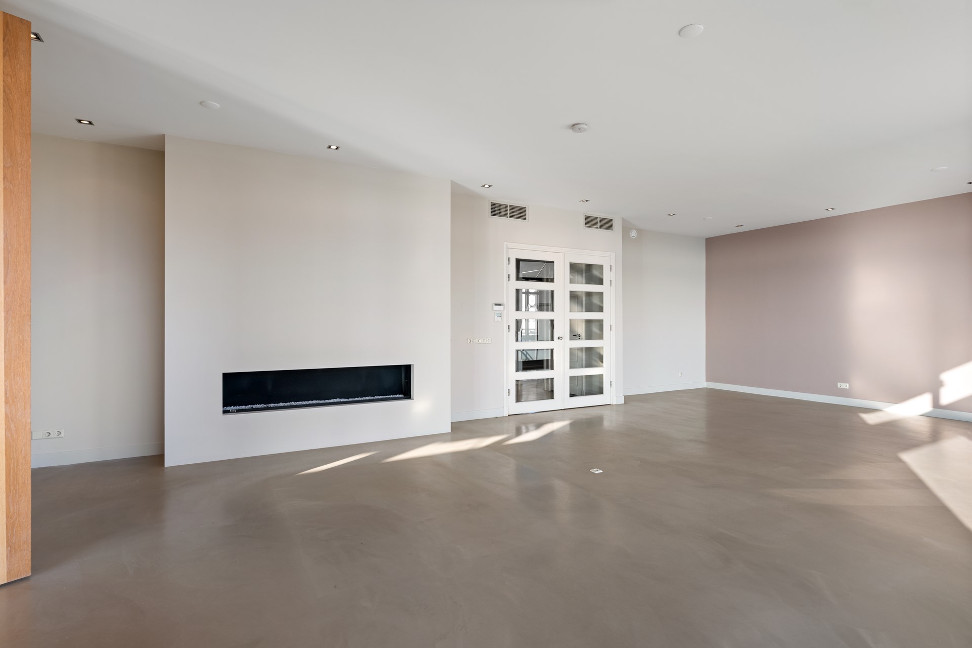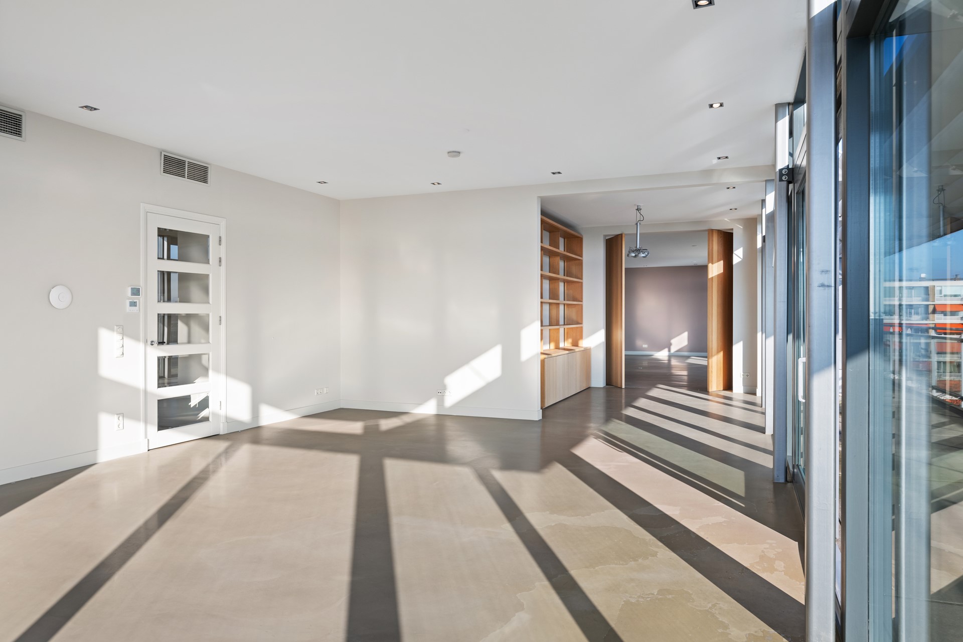 Lichte woonkamer, 3 meter hoog, glaspuien tot de vloer. Open haard (gas). Aparte doucheruimte. Schuifpui naar het grote zonnige terras. Halfopen keuken met deur naar terras.