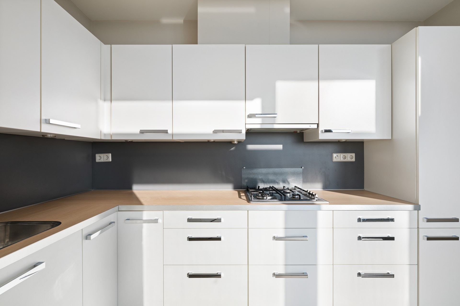 Keuken met nieuwe Siemens inbouwapparatuur. Koelkast, vriezer, vaatwasser, combi-oven/magnetron, inductiekookplaat en afzuigkap.