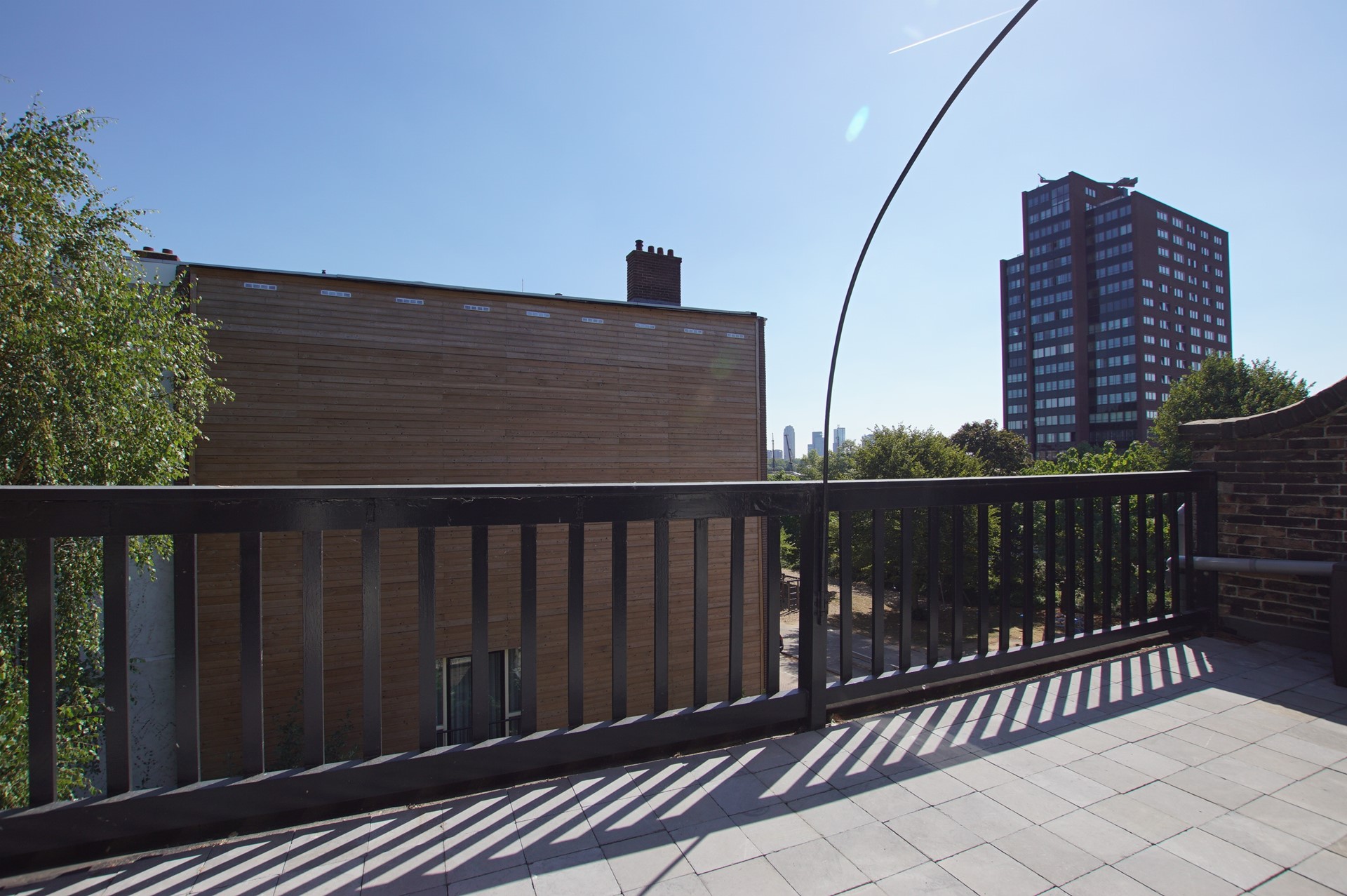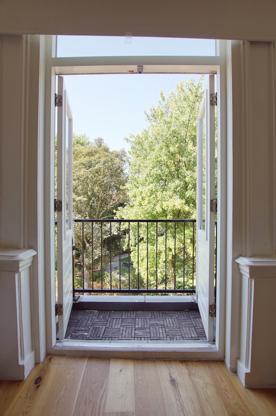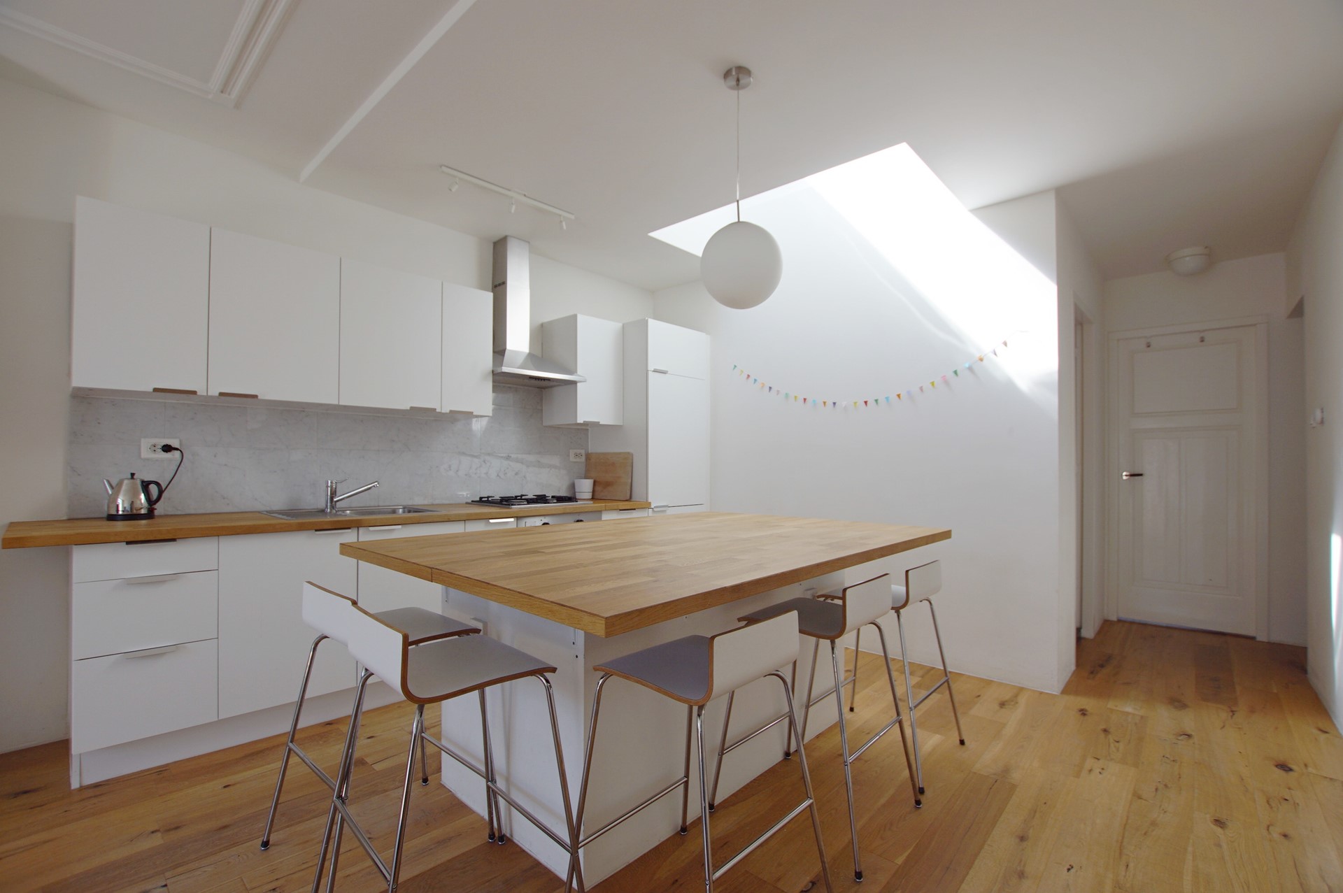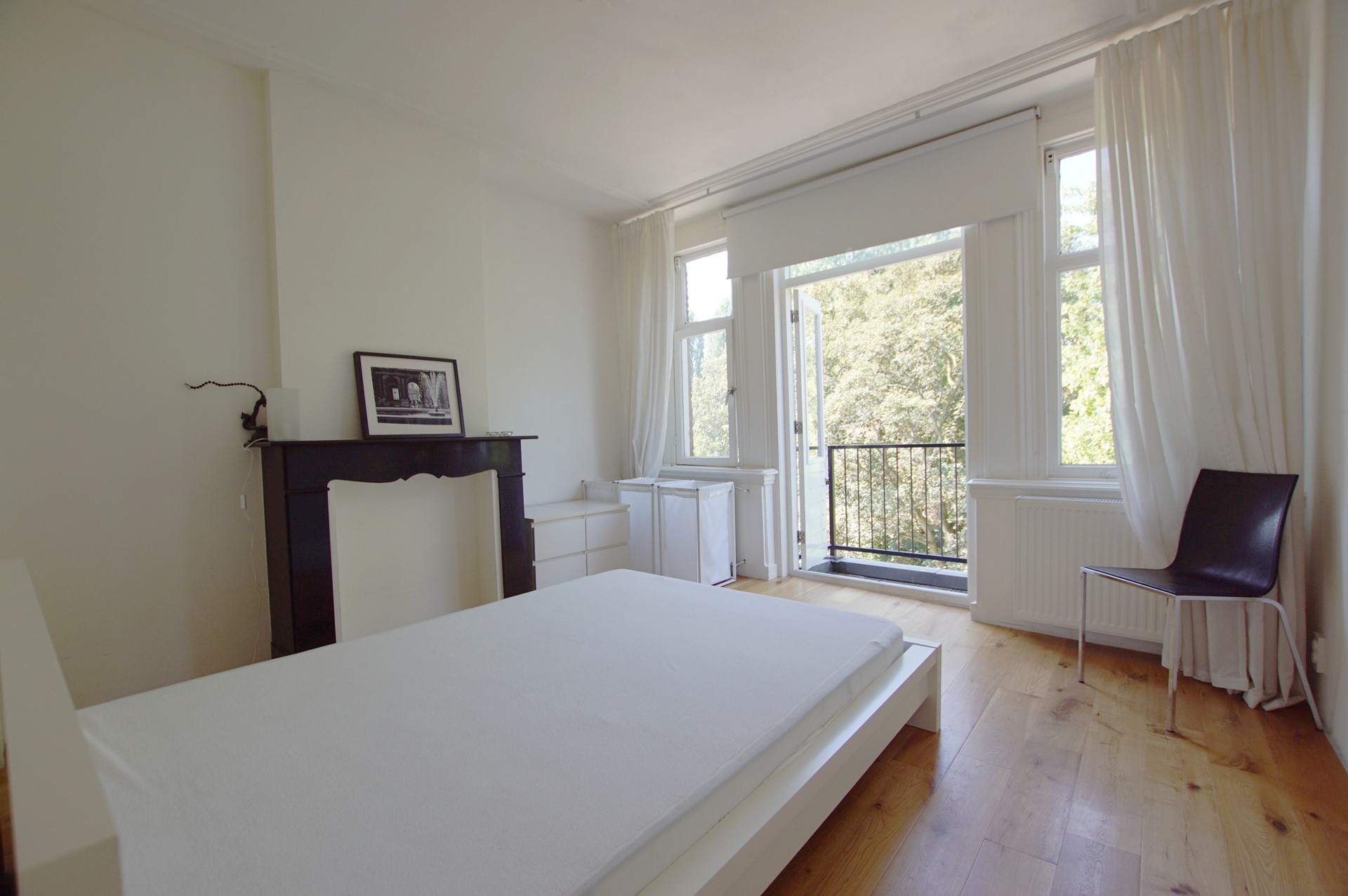 DERDE VERDIEPING: Eigen entree, hal met directe toegang tot de woonkamer. Separaat toilet met fonteintje. Lichte woonkamer met open keuken en keukeneiland met stoelen, gelegen aan de achterzijde. De keuken is voorzien van een kookplaat, oven, koelkast, vriezer en vaatwasser. Ruim en zonnig balkon bereikbaar vanuit de woonkamer. De volledig betegelde badkamer is voorzien van een ruime inloopdouche, wastafel met meubel en spiegel en een aansluiting voor de wasmachine. Ruime slaapkamer met bed en toegang tot het tweede balkon. Werkkamer, ideaal als studeer- of thuiswerkruimte. Tweede werkkamer met logeerbed en toegang tot het tweede balkon via openslaande deuren die volledig geopend kunnen worden.