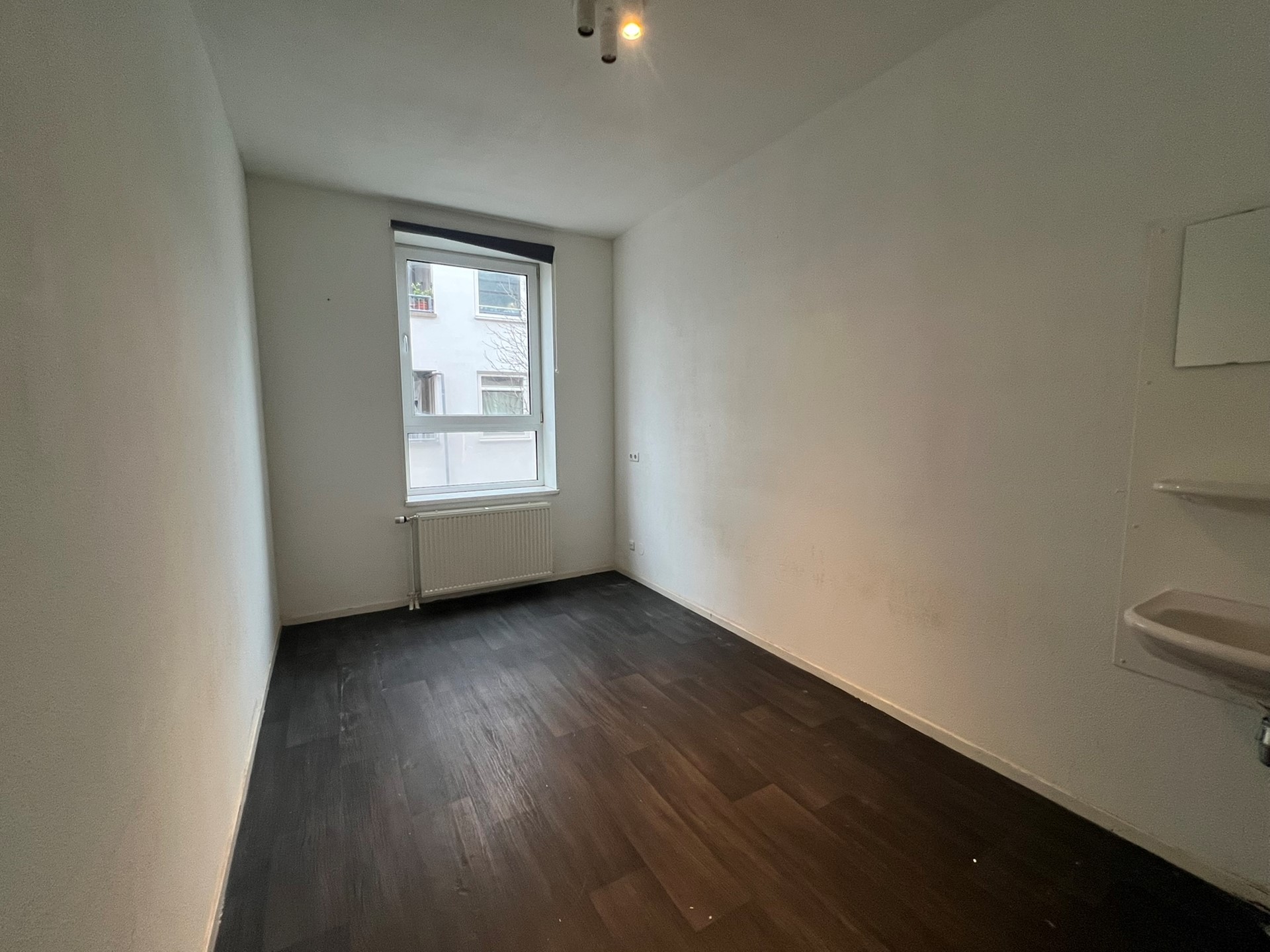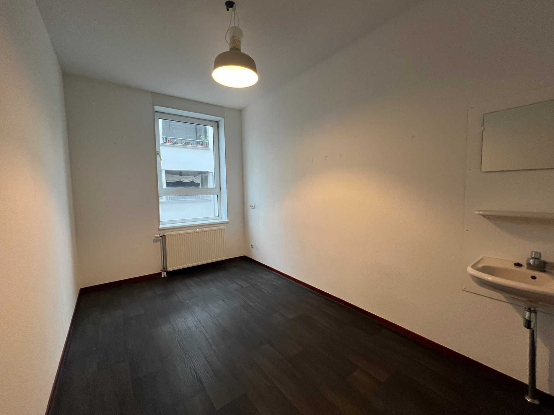 EERSTE VERDIEPING: Vanuit de hoofdgang is er toegang tot de keuken, 2 slaapkamers, werkkamer en woonkamer. De keuken is voorzien van een wasbak, kookplaat en afzuiging. Vanuit de keuken is er toegang tot de tweede gang. De tweede gang geeft toegang tot het balkon, separaat toilet met klein fonteintje en de badkamer. Badkamer voorzien van douche, wastafel met spiegel en toilet. Twee ruime slaapkamers en werkkamer met elk een eigen wastafel met spiegel. Lichte woonkamer gelegen aan de zijkant van de woning.