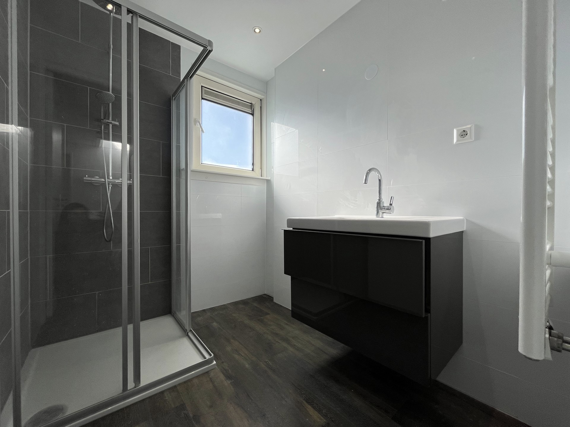 TWEEDE VERDIEPING: Twee volwaardige slaapkamers en één ruime werkkamer. Badkamer voorzien van douche, handdoekradiator, wastafel meubel. Vanaf de tweede verdieping heb je toegang tot het dakterras.