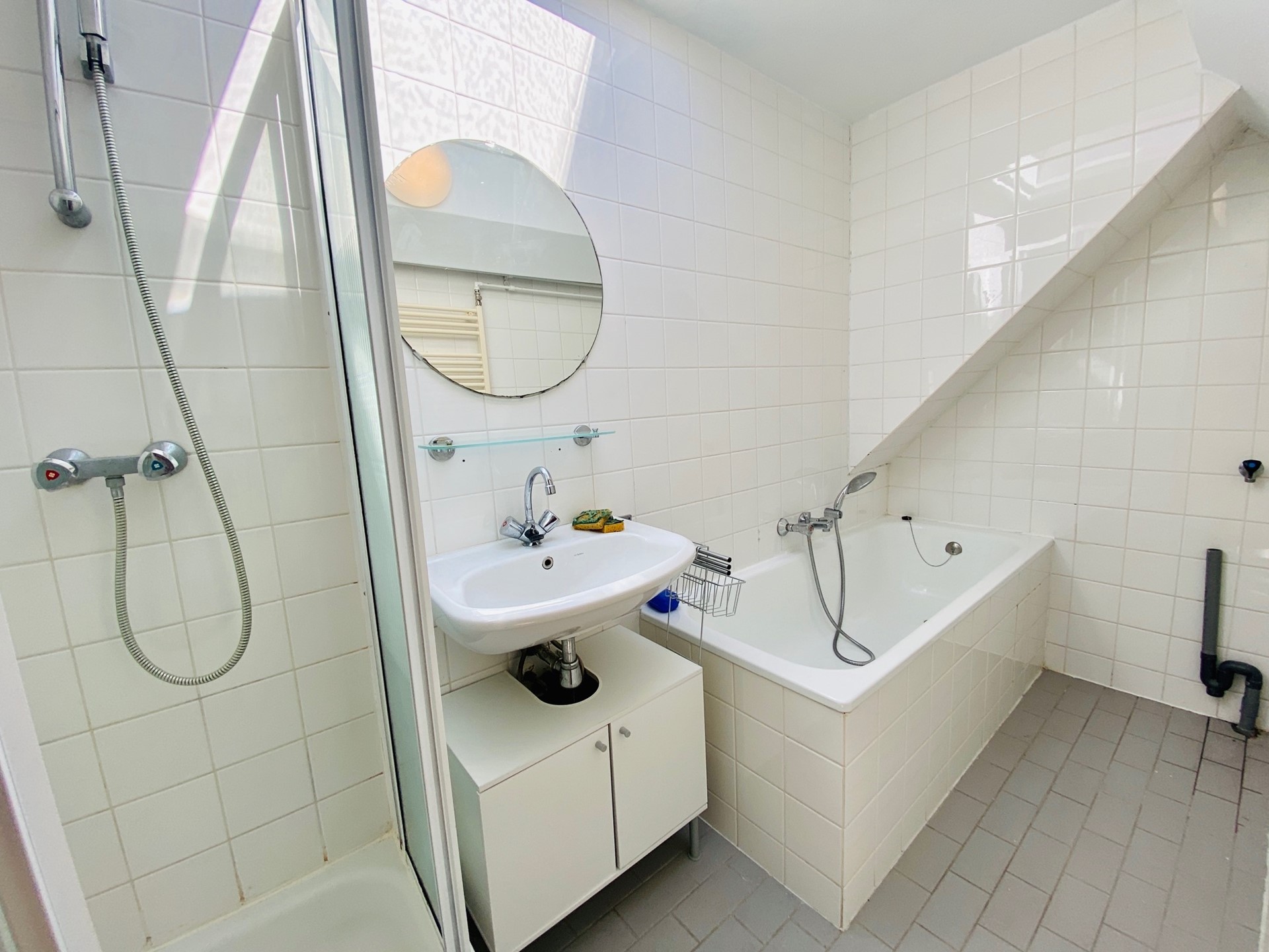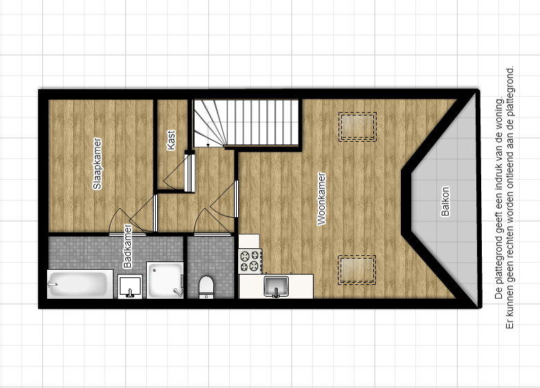 VIERDE VERDIEPING: Gang met toegang tot alle vertrekken en separaat toilet. Aan de voorzijde is de lichte woonkamer met open keuken en toegang tot het balkon. De keuken is voorzien van een 4-pits kookplaat, afzuigkap, oven en een koelkast. Aan de achterzijde van de woning ligt de slaapkamer met toegang tot de badkamer. De volledig betegelde badkamer is voorzien van een ligbad, aparte douche en wastafel met spiegel.