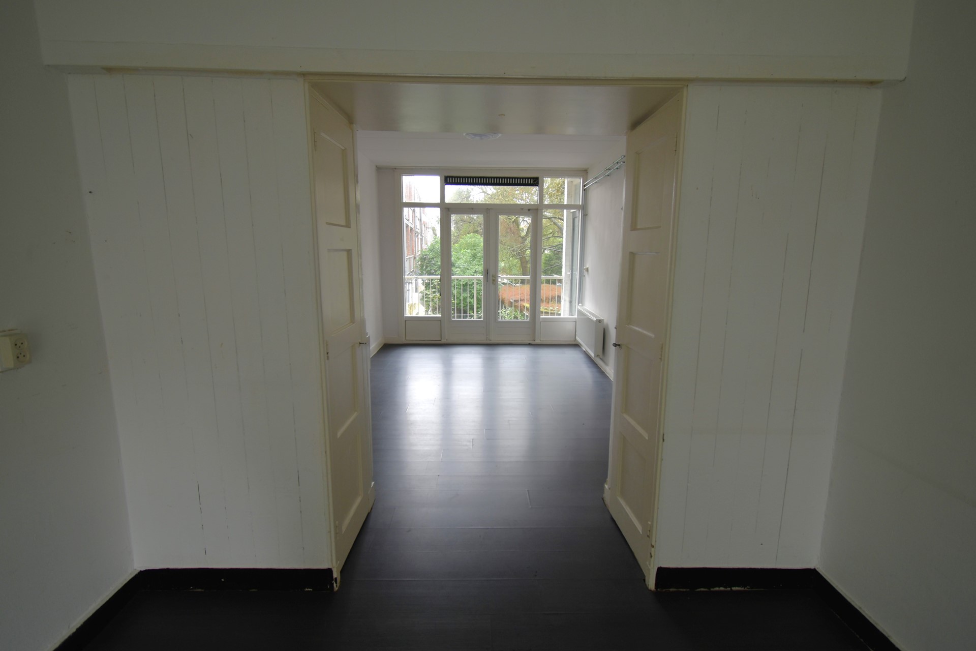 TWEEDE VERDIEPING: Binnenkomst in de hal met toegang tot de lichte doorzon woonkamer. Aan de achterzijde bevindt zich de eenvoudige, witte keuken (zonder apparatuur). Zowel vanuit de woonkamer als vanuit de keuken is er toegang tot het balkon. In de hal bevinden zich tevens het separate toilet en de trapopgang naar de derde etage.